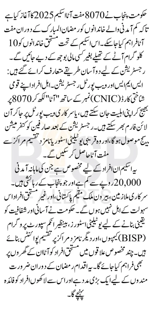 The 8070 Muft Atta Scheme is a government initiative specifically designed to provide financial relief to low-income households by distributing free flour during Ramadan 2026 . The goal of this program is to help those who are financially struggling and unable to purchase essential food supplies due to rising costs.