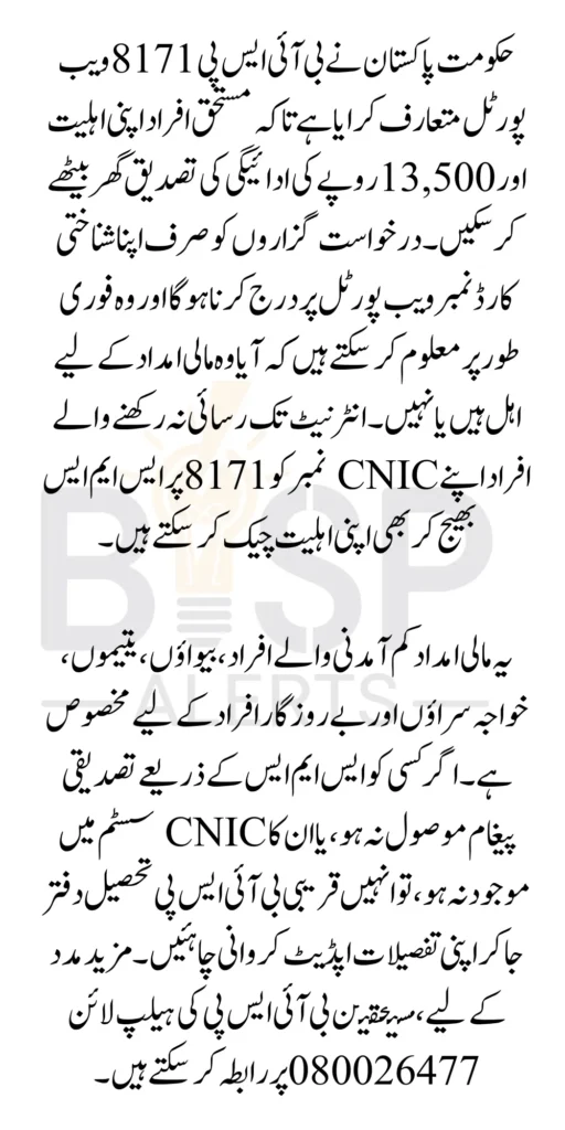 The BISP 8171 web portal has significantly simplified the process of checking eligibility and verifying 13500 payments online. Whether you use the web portal or the SMS service 8171, both methods provide a quick and secure way to confirm your payment status.
