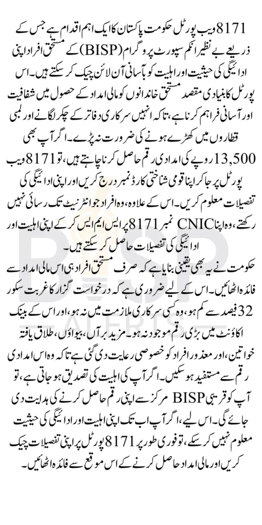 The 8171 Web Portal is a valuable digital initiative that makes it easy for Pakistani citizens to check their BISP 13500 payment status online. Whether through the official web portal or SMS service, beneficiaries can verify their eligibility and payment details without the hassle of visiting government offices.