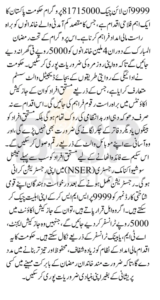 9999 Online Check 5000 8171 Program is a government initiative aimed at providing direct financial assistance to low-income families in Pakistan. With a total budget of Rs 20 billion, the program is designed to support 4 million families by offering Rs 5,000 per household. This financial aid is particularly focused on helping families manage their expenses during Ramadan, a month that brings increased financial strain due to higher food and utility costs.