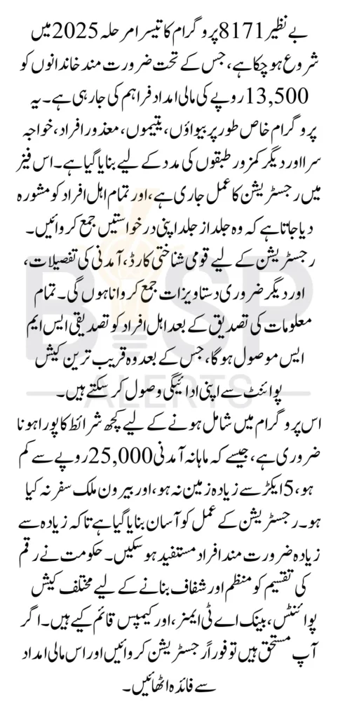 The Benazir 8171 Program Phase 3 for 2025 is a golden opportunity for low-income families to receive financial assistance of 13,500. With simple registration steps and clear eligibility criteria, the program ensures that financial aid reaches those who need it most. If you haven’t applied yet, don’t wait submit your registration application today and secure your support for 2025.