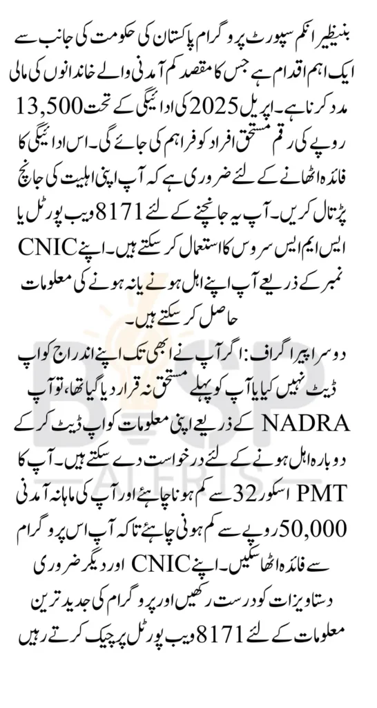 Benazir April 2025 Payment Eligibility April 2025 payment installment of Rs. 13,500 has officially been announced by the Government of Pakistan, and payments will begin from April 10, 2025. But before you plan to collect your payment, one important thing needs to be done check your eligibility status using your CNIC. Whether you’re a new applicant or someone who missed the January installment, this article will guide you step-by-step on how to confirm if you’re eligible or not eligible for this month’s payment.