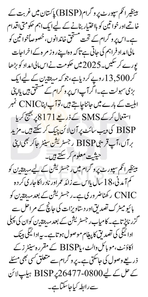 Benazir Income Support Program CNIC Check With millions of women benefiting from the program, it has become a significant step toward empowering women and reducing poverty in the country. In 2025, the BISP has announced a new payment amount of Rs. 13,500 to deserving families, marking an increase in the aid provided to help them manage daily expenses and improve their living conditions. If you’re one of the beneficiaries or want to check if you’re eligible, this article will guide you on how to check your BISP status via CNIC and other important information related to payments, registration, and eligibility.