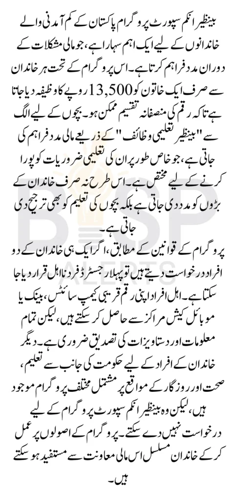 - Children’s Scholarships: Children in the family can benefit from Benazir Educational Scholarships for their academic expenses.