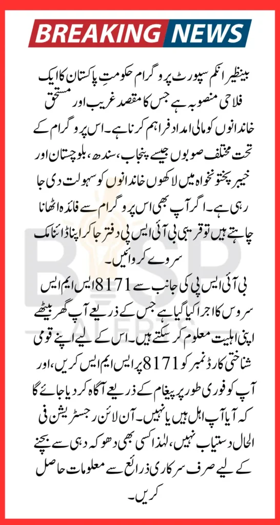 To benefit from BISP, it’s essential to complete the dynamic survey at your nearest BISP office. While online registration is not available yet, the 8171 SMS service helps you check your eligibility instantly. Stay connected with official updates and always use government-recommended methods for registration and payment tracking.