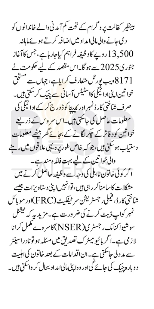 The government’s updated 8171 web portal is a game-changer for women enrolled in the Benazir Kafalat Program. With the stipend increasing to Rs. 13,500 in January 2026 , beneficiaries should proactively verify their eligibility and payment status.