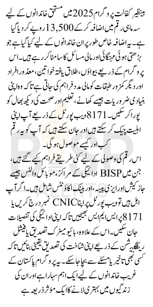 Benazir Kafalat 13500 Payment Check In 2025, the program has made a significant update payment amounts have been increased to 13500 for the January to March installment. This is great news for families struggling to meet daily expenses, especially amidst rising inflation. If you are eligible, the 8171 Web Portal is the best place to verify your status and ensure you can receive your payment without any issues.