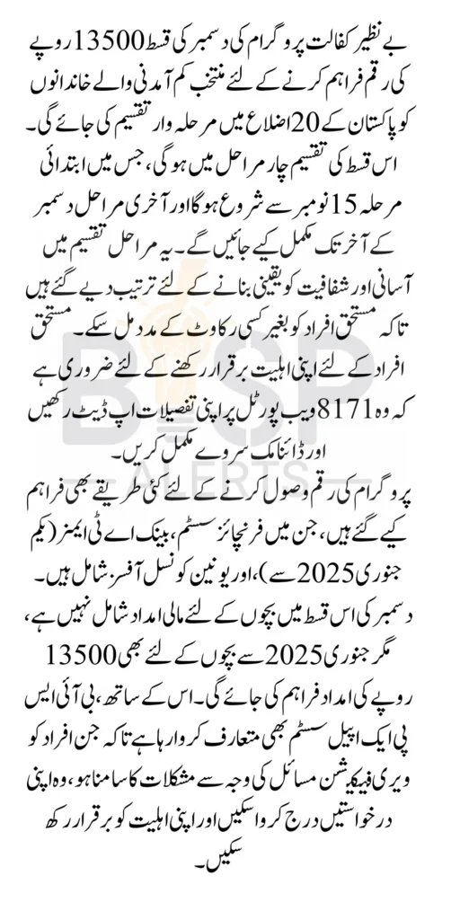 The Benazir Kafalat Program’s December installment of 13,500 is on the way for eligible beneficiaries. This payment cycle is organized into four phases, allowing recipients in specific regions to receive their funds in an orderly manner. By breaking the distribution into phases, BISP (Benazir Income Support Program) ensures that the financial aid reaches families in need as efficiently as possible. This structured rollout includes selected districts in Punjab, Khyber Pakhtunkhwa, and Balochistan.