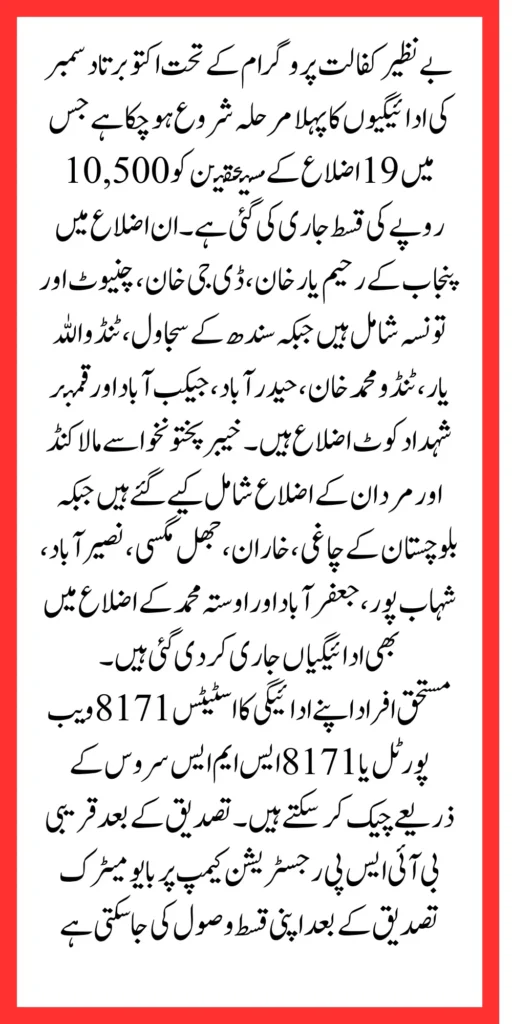 Benazir Kafalat October to December payment of Rs. 10500 has been released Benazir Kafalat installments have been released in 19 districts during the first phase across Pakistan In these 19 districts, 4 districts of Punjab, Rahim Yar Khan, DG Khan Chiniot and 6 districts of Sindh, Sajawal, Tando Aliyar, Tando Muhammad Khan, Hyderabad, Jacobabad, Qamber, Shahdad Kot, 2 districts of Khyber Pakhtunkhwa, Malakunda and Mardan. While 7 districts of Balochistan include Chagai, Kharan, Jhal Magsi, Nasirabad, Sahabpur, Jafarabad and Awsta Muhammad.