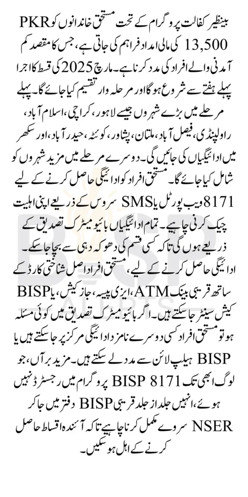 Benazir Kafalat Program 2025 March Installment 13500 of 13,500 is a vital financial relief initiative for low-income families across Pakistan. The government has implemented a structured payment schedule, starting with Phase 1 cities and expanding to Phase 2 in the coming weeks.