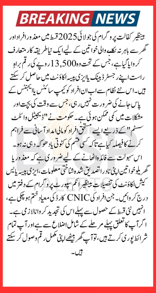 Benazir Kafalat Program July Payments continues to provide critical financial support to low-income families across Pakistan. In July 2025, the government has introduced a major update to the payment system that directly benefits disabled persons and homebound women. For the first time, a dedicated and inclusive withdrawal process has been put in place to ensure that beneficiaries who cannot physically reach campsites or agents can still access their full payments with dignity and convenience. This article explains everything you need to know about the new withdrawal process, eligibility, and how to register for digital payment options.