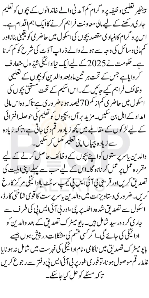 The Benazir Taleemi Wazaif Program is a financial assistance initiative under the Benazir Income Support Program The primary goal is to support low-income families by providing cash stipends to children enrolled in schools. Here’s how the program works: