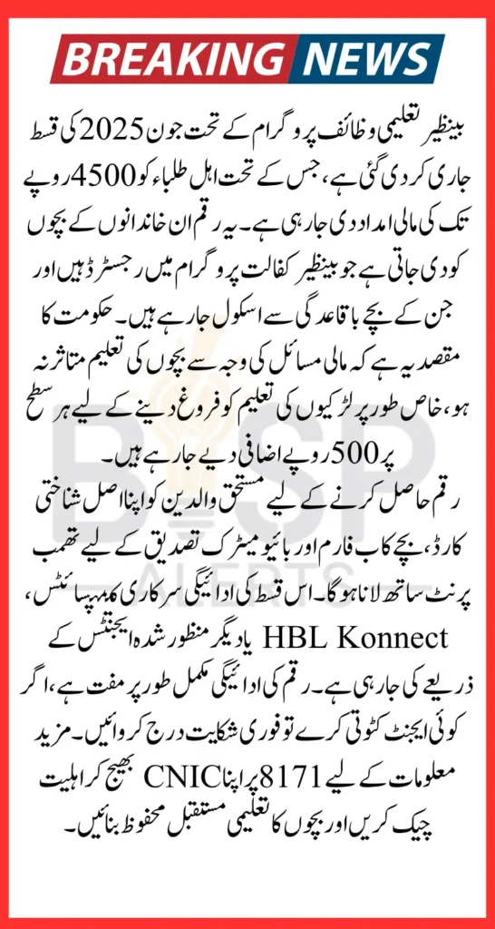 Benazir Taleemi Wazaif Stipend June 2025