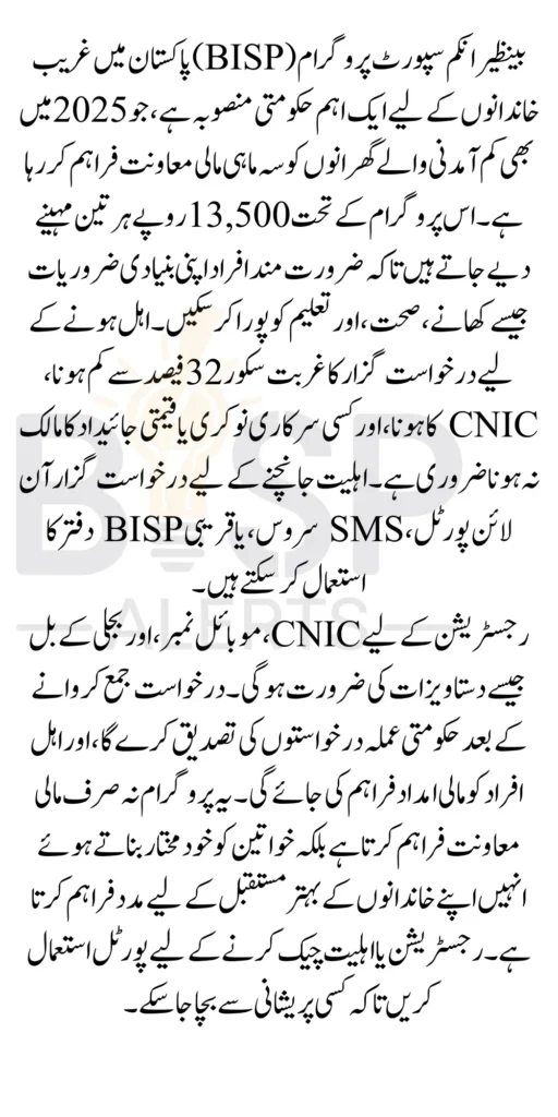 The BISP 13,500 Payment Program is a government welfare initiative providing quarterly financial assistance to low-income families in Pakistan.