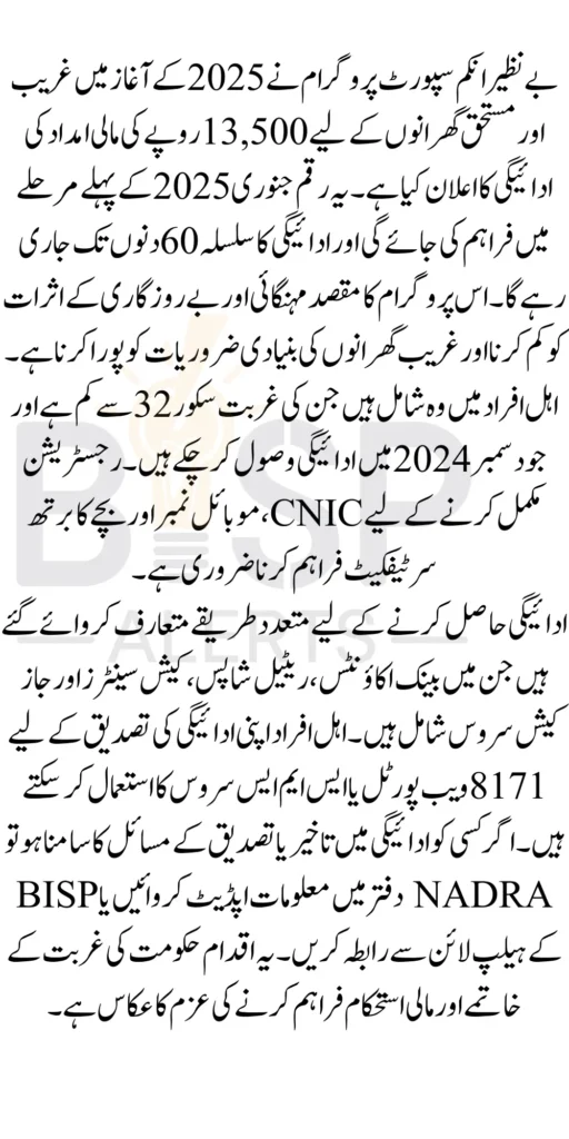 BISP 13500 Payment Notifications payment under the Benazir Income Support Program is a crucial initiative to support Pakistan’s most vulnerable families. With payments starting from January 2025, beneficiaries are encouraged to complete their registration and verification processes promptly. Use official resources like the 8171 Web Portal, SMS service, and BISP offices to stay informed and ensure a hassle-free experience.