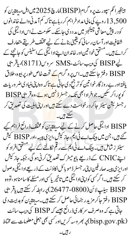 BISP 8171 March 13500 Payment continues to provide much-needed financial assistance to low-income families across Pakistan. For March 2025, eligible beneficiaries will receive 13,500 PKR under this program. The government has introduced multiple methods to check payment status and receive funds to ensure transparency and ease of access for all recipients. If you are already registered or wish to verify your payment status, this guide will walk you through the entire process in detail.