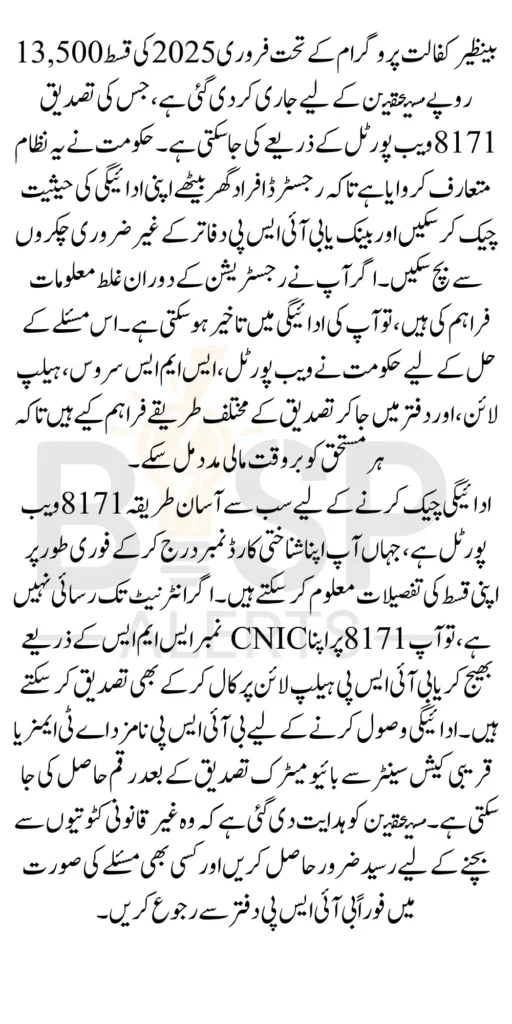 To solve this issue, the government now provides multiple verification methods, including the 8171 web portal, SMS service, helpline, and in-person verification at BISP offices. Verifying your payment ensures that you: