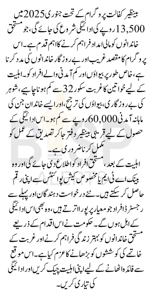 The BISP program provides financial assistance to poor and unemployed families across Pakistan, particularly women, to help them lead a more stable life. Starting in January 2025, the government will distribute Rs. 13,500 to each eligible family.