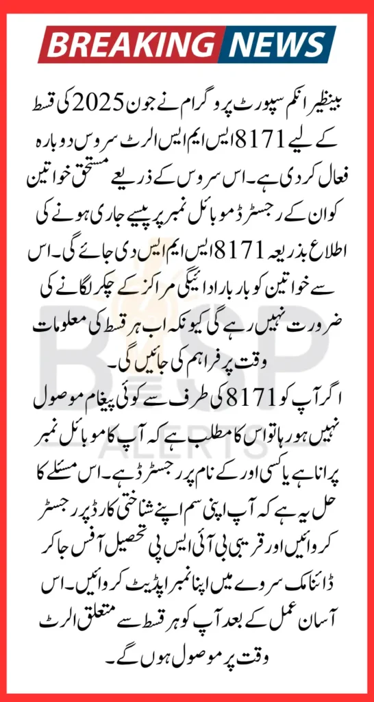 BISP June Payment 8171 SMS Alerts BISP has launched an important update to improve its communication system with female beneficiaries. Starting from June, BISP has activated the 8171 SMS alert service, which is designed to send payment notifications directly to your mobile phone. This means that when your payment is released, you will receive an official SMS from 8171 confirming the amount is ready for withdrawal.