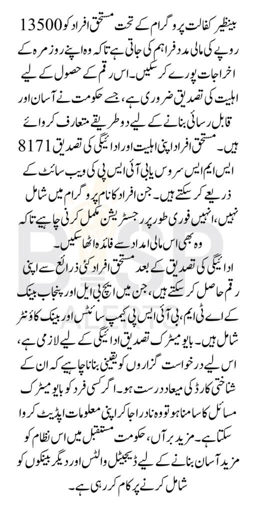 BISP Kafalat 13500 Cash Payment Under this initiative, eligible individuals receive 13500 to help manage their daily expenses. However, before receiving the payment, every beneficiary must go through a verification process. The government has made this process simple and accessible by offering two easy methods to verify payments.