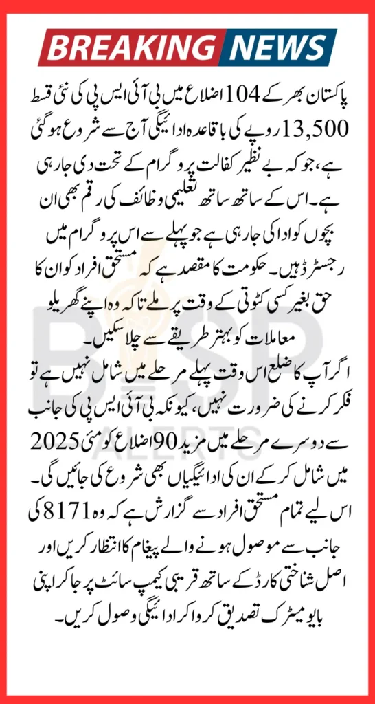 پاکستان بھر کے 104 اضلاع میں آج سے بی آئی ایس پی کی نئی قسط کی ادائیگیاں باقاعدگی سے شروع ہو گئی ہیں۔ ان ادائیگیوں میں بے نظیر کفالت پروگرام کی رقم 13,500 روپے اور تعلیمی وظائف کی رقم شامل ہے۔ مستحق خواتین اپنے اصل شناختی کارڈ کے ساتھ قریبی کیمپ سائٹ پر جا کر بایومیٹرک تصدیق کے بعد رقم وصول کر سکتی ہیں۔