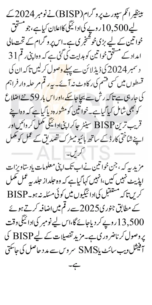 BISP November 10500 Payment continues to provide essential financial assistance to women across Pakistan. The second phase of payments has brought relief to beneficiaries in 59 new districts. If you are eligible, don’t wait visit your nearest payment center today and collect your 10,500 before the December 31 deadline.