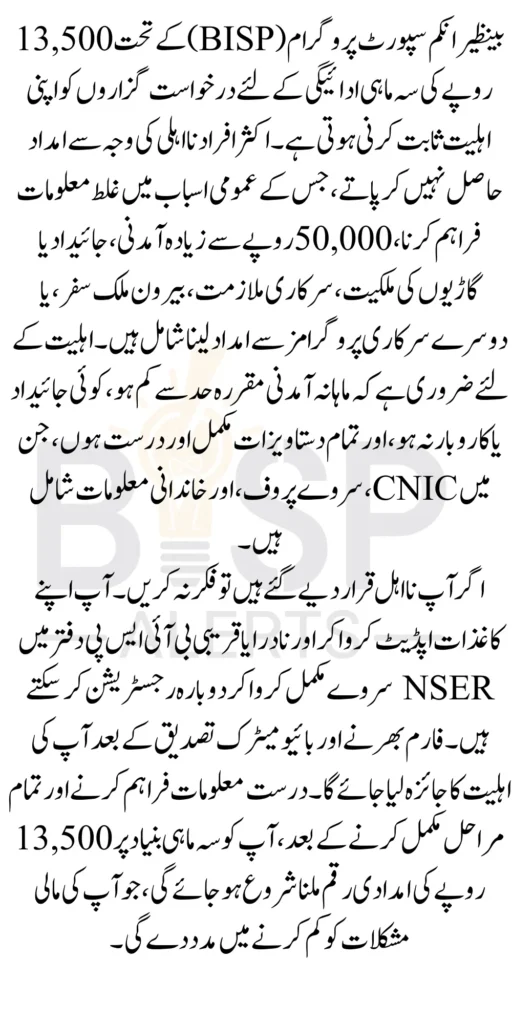 Although many people benefit from BISP, not everyone is automatically eligible. There are certain criteria that must be met to qualify for the BISP 13500 payment. If you have been disqualified, you can follow specific steps to remove your ineligibility and complete the re-registration process.