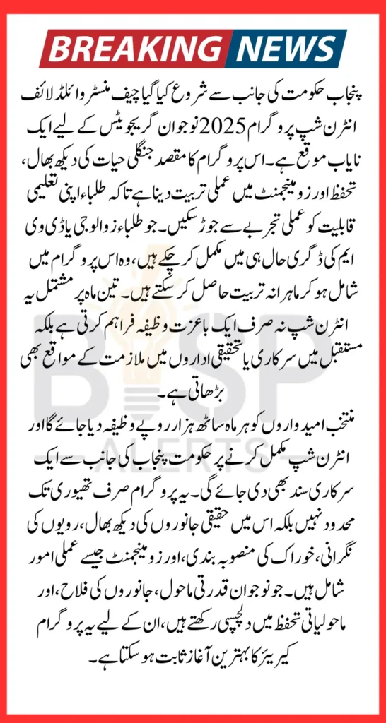 یہ انٹرن شپ حکومت پنجاب کی جانب سے ایک انقلابی قدم ہے جس کا مقصد نوجوان گریجویٹس کو جنگلی حیات کی دیکھ بھال اور تحفظ سے متعلق عملی تربیت دینا ہے۔ اگر آپ نے زوالوجی یا ڈی وی ایم کی ڈگری حال ہی میں مکمل کی ہے، تو آپ اس سنہری موقع سے فائدہ اٹھا سکتے ہیں۔