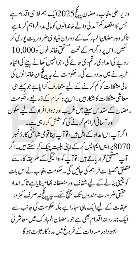 CM Punjab Ramzan Package 2026 Government of Punjab has announced the CM Punjab Ramzan Package 2026 to provide financial support to low-income families during the holy month of Ramadan. Under this initiative, eligible families will receive a cash grant of PKR 10,000 to help them manage essential expenses during Ramadan. This program is part of the government’s efforts to reduce financial burdens and ensure that the underprivileged can observe the holy month with dignity and ease.