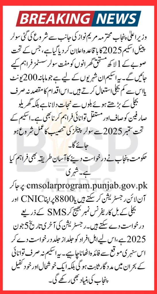 In a significant move to tackle the growing energy crisis and support the low-income population, the Punjab Government has officially announced the distribution phase of the CM Punjab Solar Panel Scheme 2025. Launched under the leadership of Chief Minister Maryam Nawaz Sharif, this scheme is part of her broader vision to empower the citizens of Punjab through clean, affordable, and sustainable energy solutions. The official distribution of solar panel kits will begin in June 2025 and is expected to continue through October 2025, marking a major milestone in the government’s promise to deliver reliable solar energy to the people.