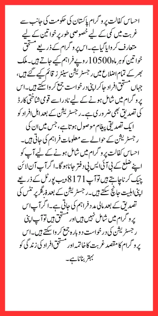 The Ehsaas Kafalat Program is designed to provide financial assistance of PKR 10,500 monthly to eligible women in Pakistan.