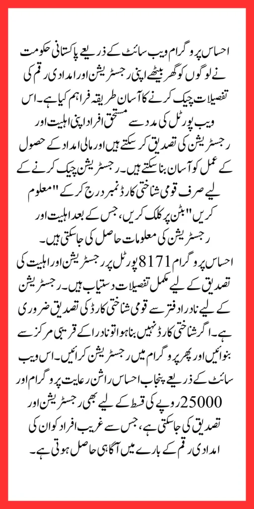 The government of Pakistan has set up a web portal on this website. With the help of this web portal, you can check your eligibility and registration details from the comfort of your home. And you don’t face any problem in checking the registration and eligibility details.