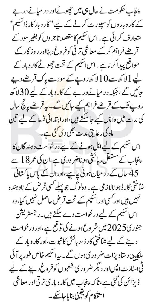 Eligibility Criteria for Karobar Card Scheme Has Been Announced The Punjab government has recently announced an initiative to support small and medium business owners: the Karobar Card Scheme. This scheme aims to empower entrepreneurs by providing interest-free loans to foster economic growth and create employment opportunities. In this article, we will discuss the eligibility criteria, loan details, and other important aspects of the scheme to help you prepare for registration.