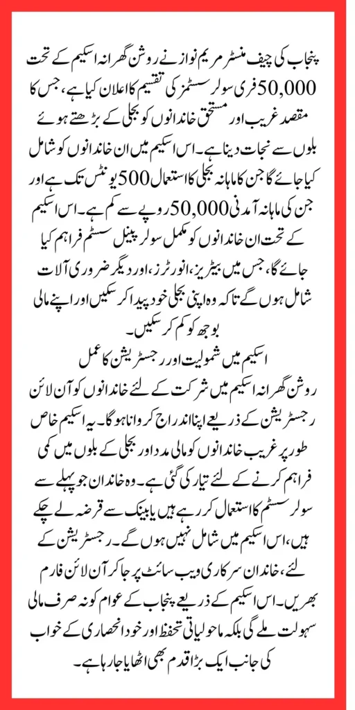 Punjab Chief Minister Maryam Nawaz has announced to give relief to people worried about high electricity bills. And the distribution of modern free solar schemes has started. This initiative targets families consuming up to 500 units of electricity per month. From which they can install solar panels and possibly reduce their electricity costs.This scheme is widely spread under the name of Roshan Gharana Scheme. Specially designed to help poor and deserving families.