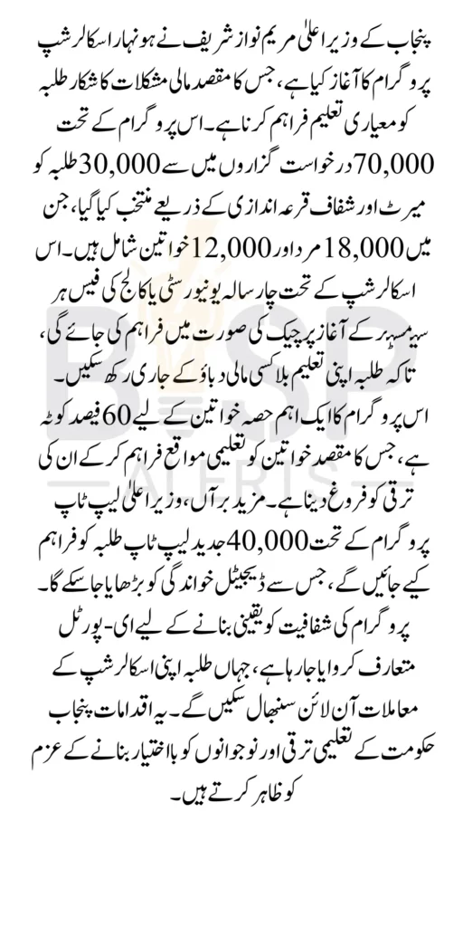 Honhar Scholarship was launched specifically to empower young women through education. Punjab Chief Minister Maryam Nawaz has emphasized that 60 percent quota of scholarships will be allocated to girls.
