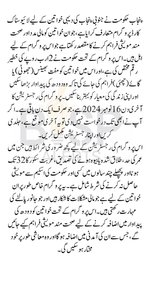 Livestock Card Registration Is Going End The Punjab government has introduced a groundbreaking initiative to empower rural women in South Punjab with the Livestock Card program, aimed at providing financial support and healthier livestock to eligible women. If you’re a woman living in rural South Punjab and haven’t yet applied, the clock is ticking – the last day to register is November 16, 2024, just one day left Here’s everything you need to know about this program, eligibility criteria, and how to apply.