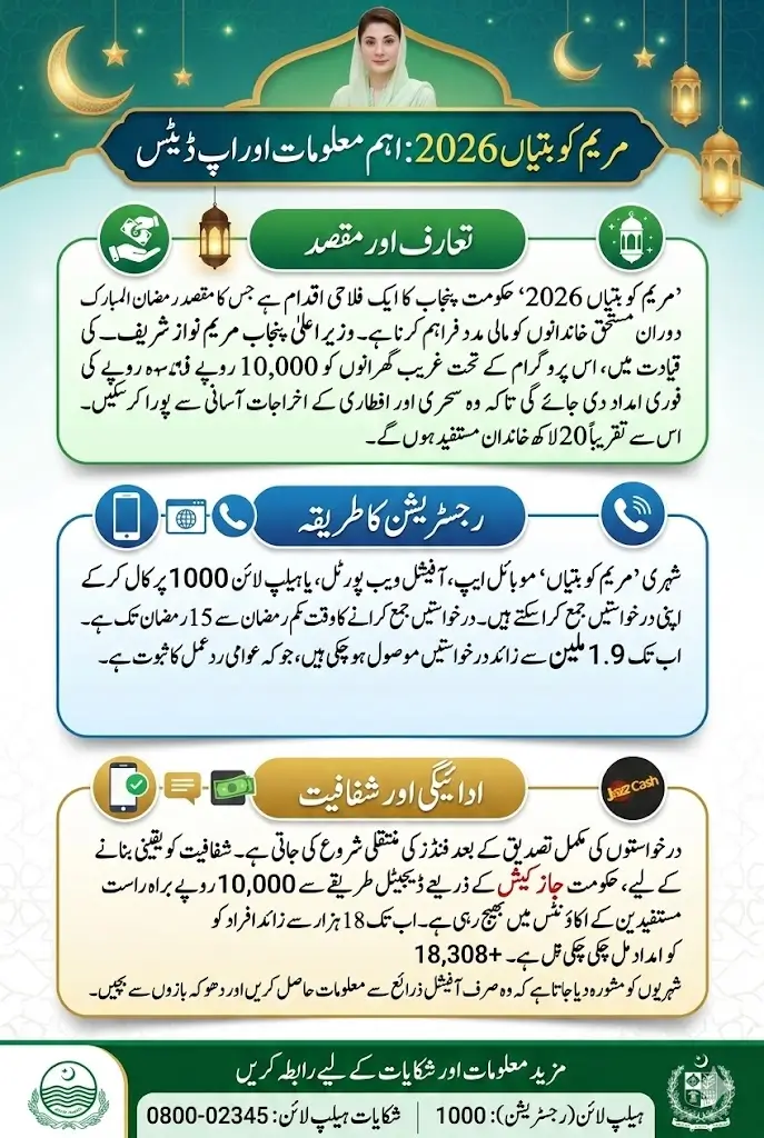 The Maryam Ko Batyan 2026 initiative represents an important step by the Punjab government to support low-income families during Ramadan. By providing Rs. 10,000 in direct financial assistance, the program aims to reduce the burden of rising expenses and help families manage their daily needs.