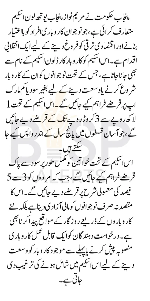 Punjab Chief Minister Maryam Nawaz has launched a youth loan scheme in which loans will be provided to youth for business. It is known as the Maryam Nawaz Punjab Youth Loan Scheme Business Card.