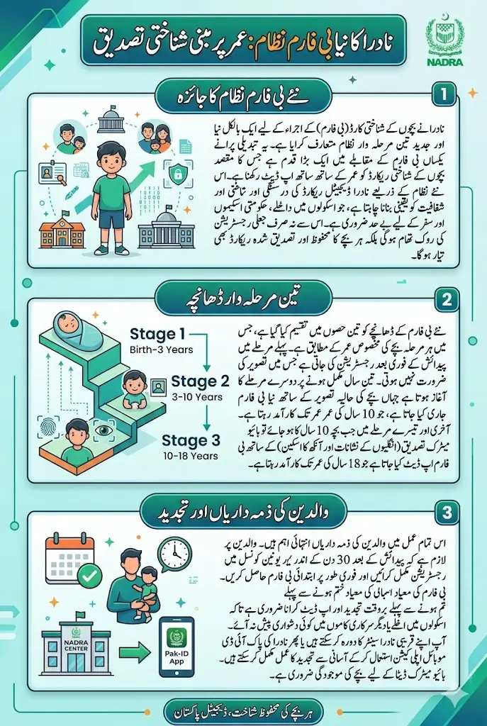 NADRA Announced New B-Form Issuance System National Database and Registration Authority (NADRA) has introduced a major update in the B-Form issuance system, bringing a completely new structure that focuses on age-based identity verification. This change is not just a minor update but a complete shift in how children’s identification records are maintained in Pakistan. Previously, a single B-Form was issued for a long period, which often became outdated as the child grew older and their appearance changed.