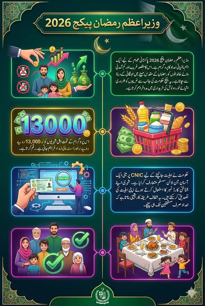 Prime Minister Ramzan Package 2026 Check CNIC Pakistan Online is an important initiative that aims to support low-income families during the holy month of Ramzan. By providing Rs. 13,000 financial assistance, the government helps citizens manage rising expenses and purchase essential household items.