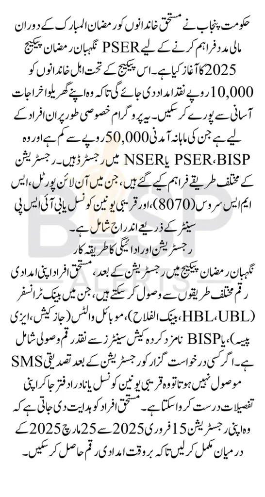 PSER Nighaban Ramzan Package Registration Punjab Government has introduced the PSER Nighaban Ramzan Package 2025 to provide financial support to low-income families during the holy month of Ramadan. Under this initiative, eligible families will receive PKR 10,000 in cash assistance to help manage their household expenses during this sacred period. This program aims to ease the financial burden and ensure that every deserving family can observe Ramadan with dignity.