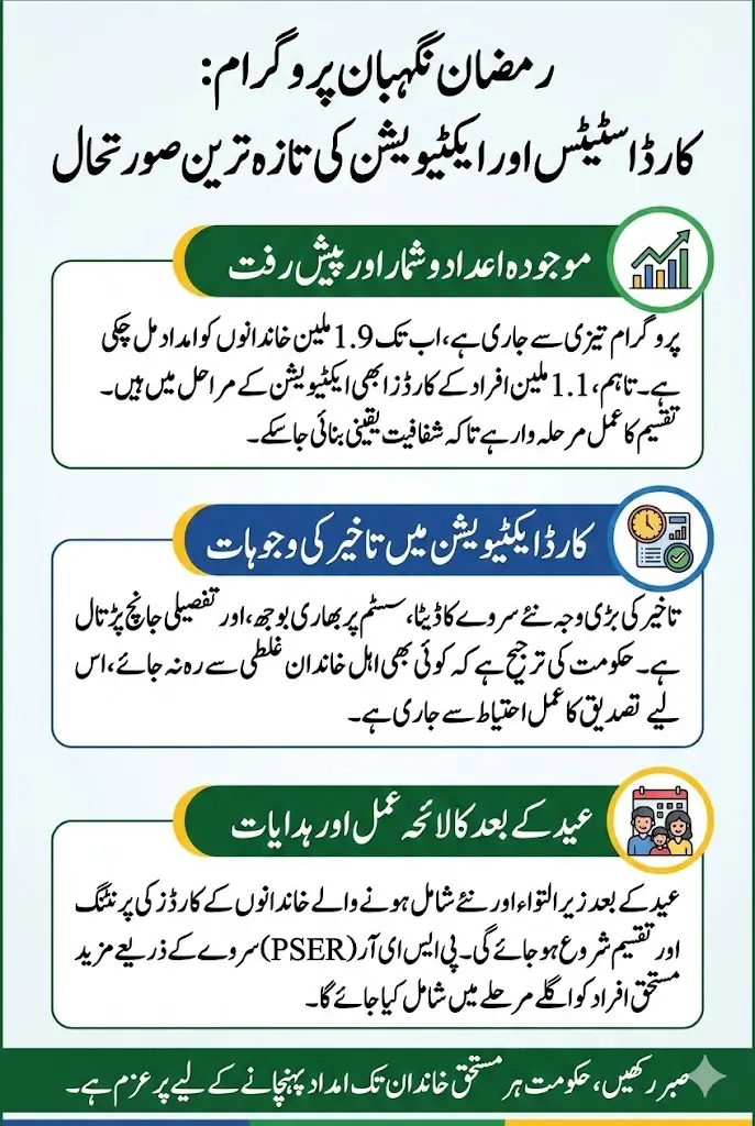 Ramzan Nigbaan Card Status & Activation Overall, the Ramzan Nigbaan Program is progressing at a steady pace. Millions have already benefited, while another large group is in the final stages of activation and verification. Although delays are natural due to the massive scale of the program, the government has guaranteed that every eligible household will receive support. Based on my observations across multiple districts, I can confirm that the system is functioning responsibly, though slowly, to ensure transparent and fair distribution.